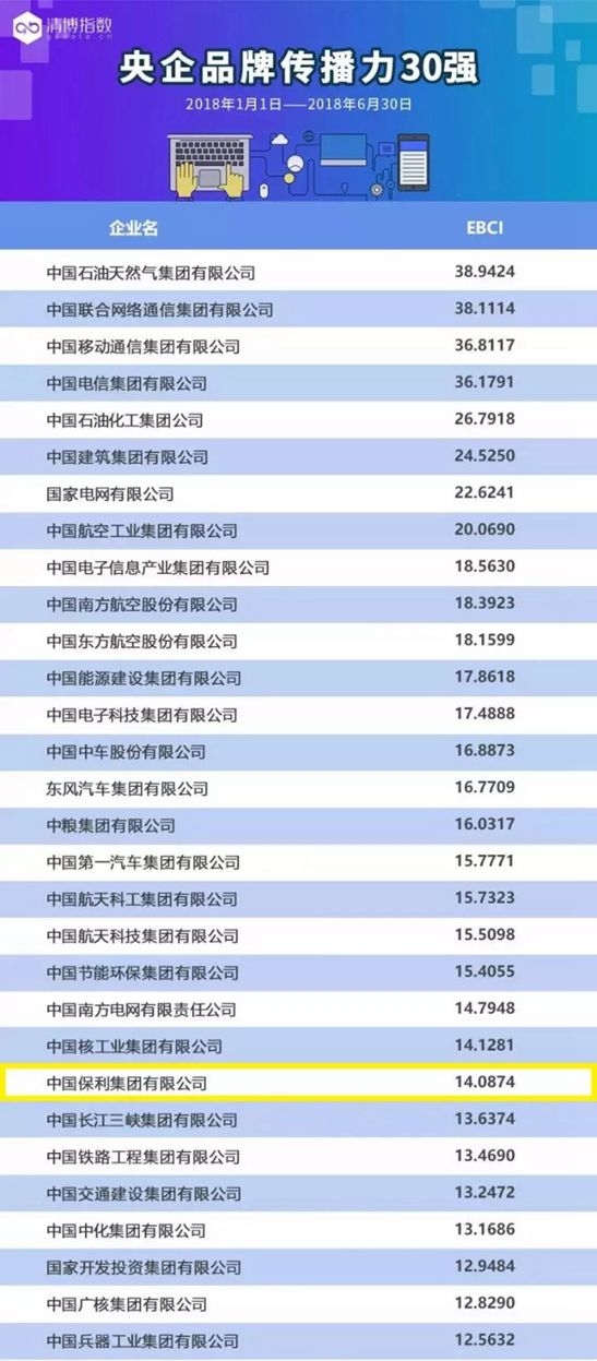 日前,2018上半年中央企業(yè)品牌傳播力榜單(簡稱“榜單”)新鮮出爐,保利集團入圍三十強,位列第23位。